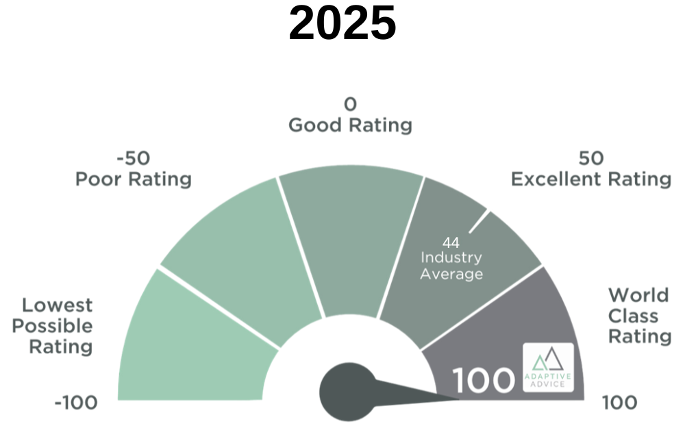 Adaptive Advice is proud to share our historical NPS scores, ranging from 84 - 100 over the last 5 years - well above the Financial Services industry average of 44*.